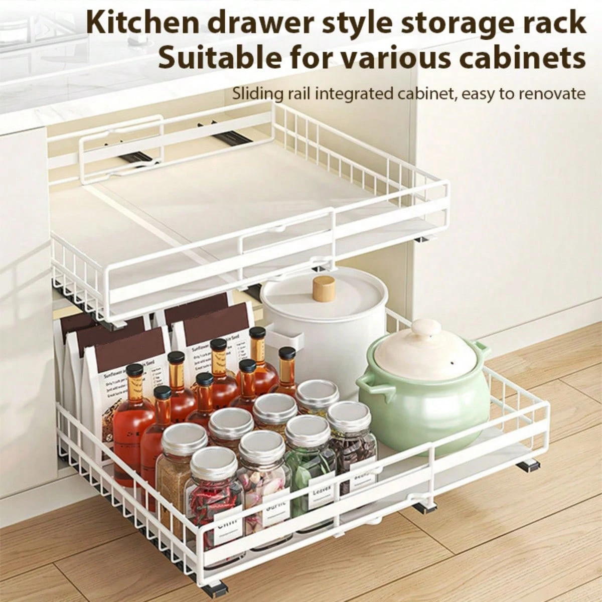 1/2 Pack Expandable Drawer Storage Rack – Adjustable Carbon Steel Sliding Storage Basket | No Drilling Drawer Storage Rack Under The Cabinet, Drawer Style Pull-Out Design, Suitable For Kitchen, Bathroom, And Closet, Efficient And Space Saving, Easy To Install, And Prevents Bending Over
