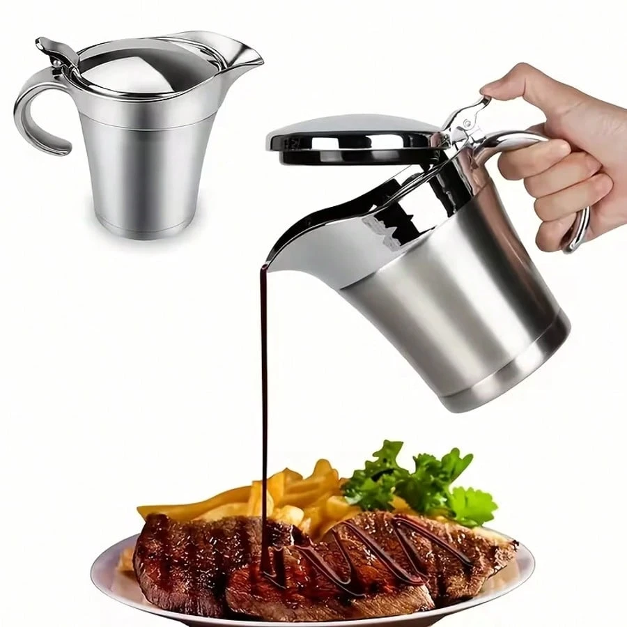 1PC 304 Stainless Steel Double-Layer Insulated Sauce Pot, 450ml Capacity, Western Steak Design For Precise Pouring, Suitable For Meat Juices, Sauces, And Seasonings, Car Kitchen Sauce Jar, Tableware Accessory, Modern Kitchen Utensil