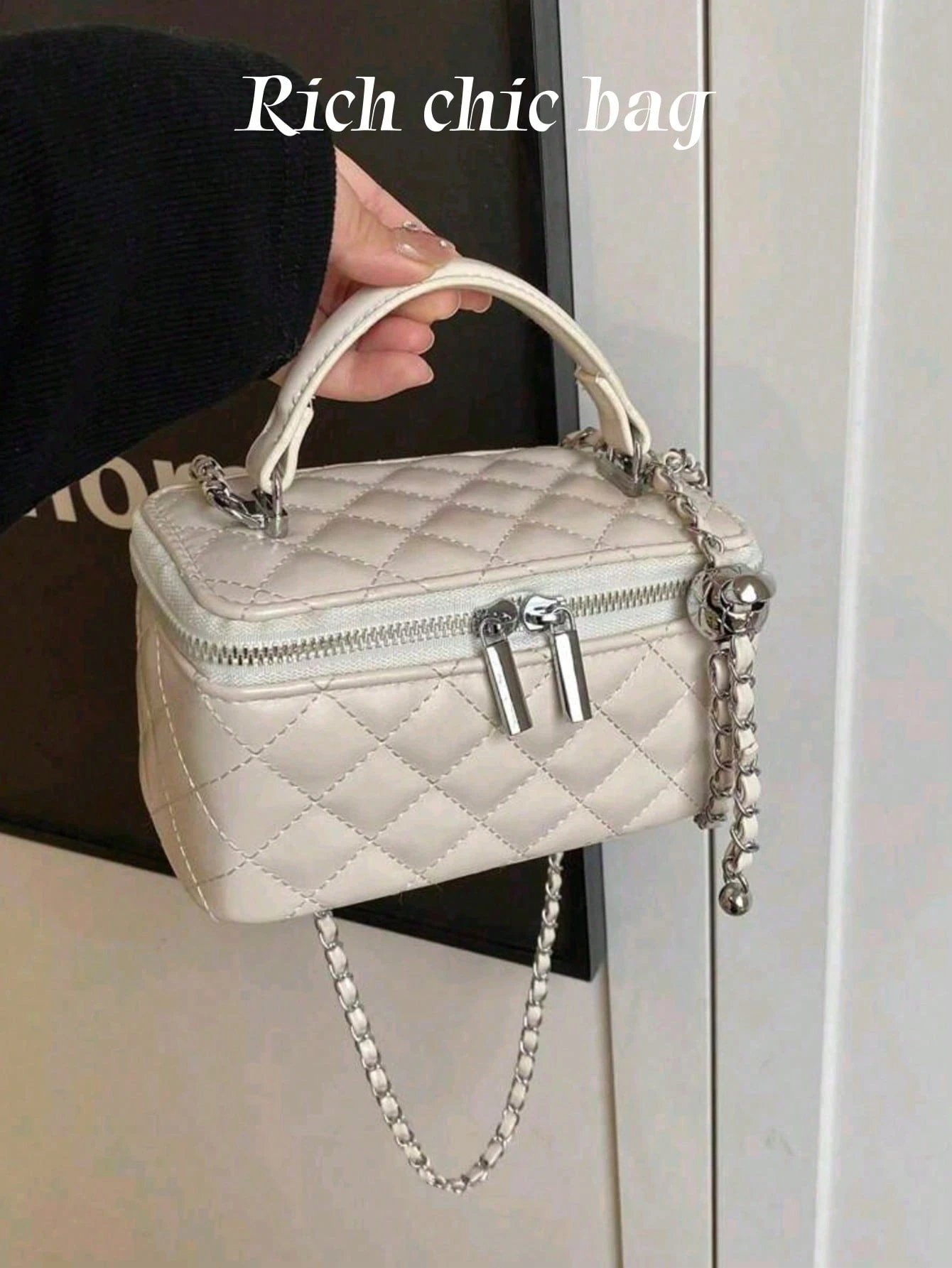 1pc Fashionable PU Quilted Diamond Embroidery Box Bag, Zipper Small Square Handbag With Strap, Versatile Shoulder Bag For Women