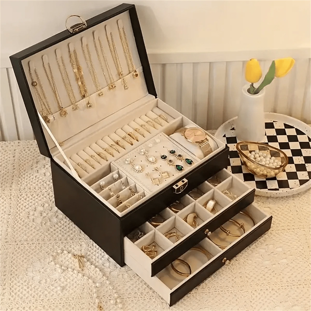 1pc Large-Capacity Three-Layer Jewelry Box, Pu Leather Multi-Functional Jewelry Box, Watch Box With Lock, Storage Box, Ring Earrings Necklace Storage Container Valentine Day