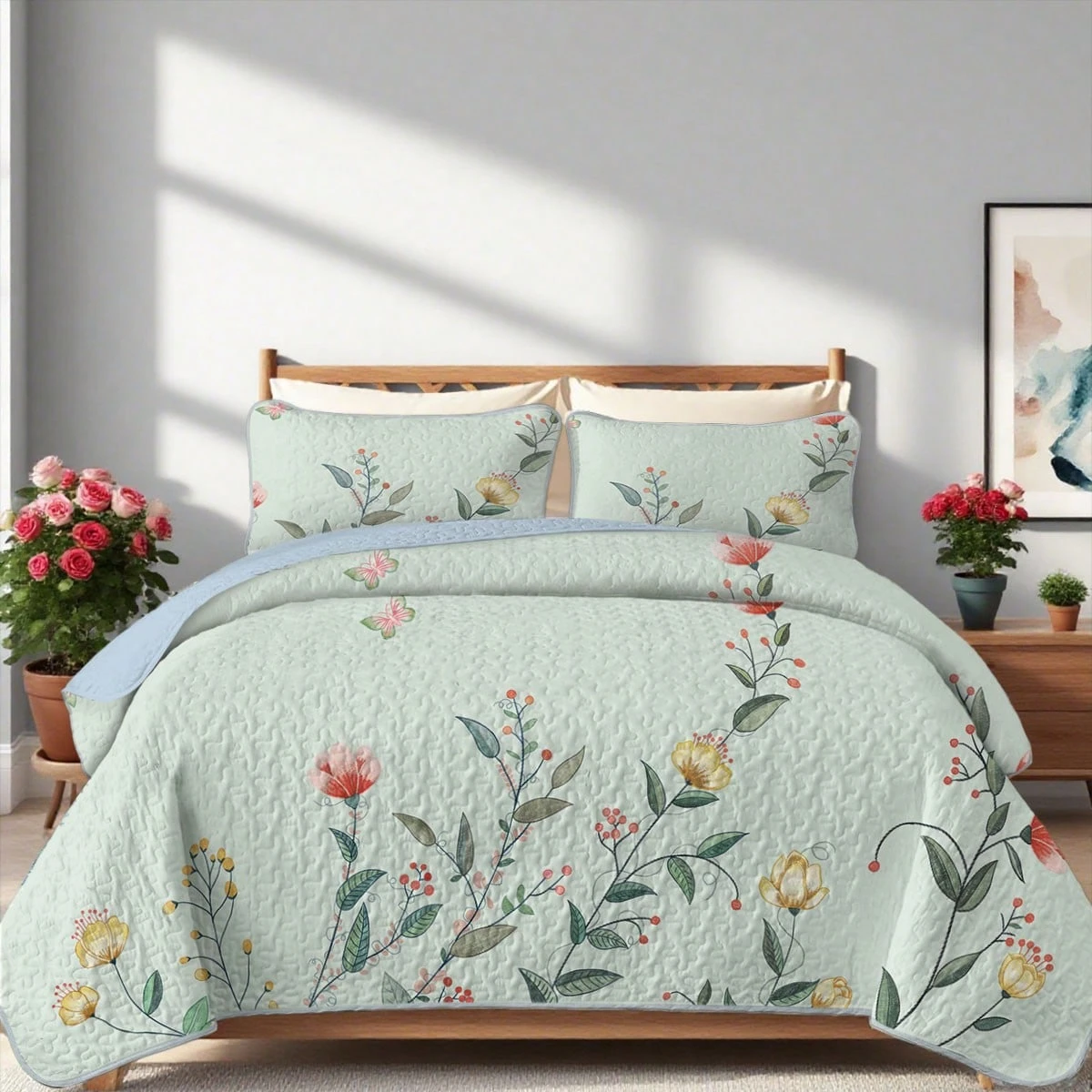 2/3-Pcs Natural Small Plant Floral Print Quilt Set, 100% Polyester Material, 1 Quilt + 1/2 Pillowcases, Elegant Summer Bedding Set, Perfect Room Decor, Suitable For All Seasons, Full/Queen, Cal King Size Bedspread Set, Machine Washable