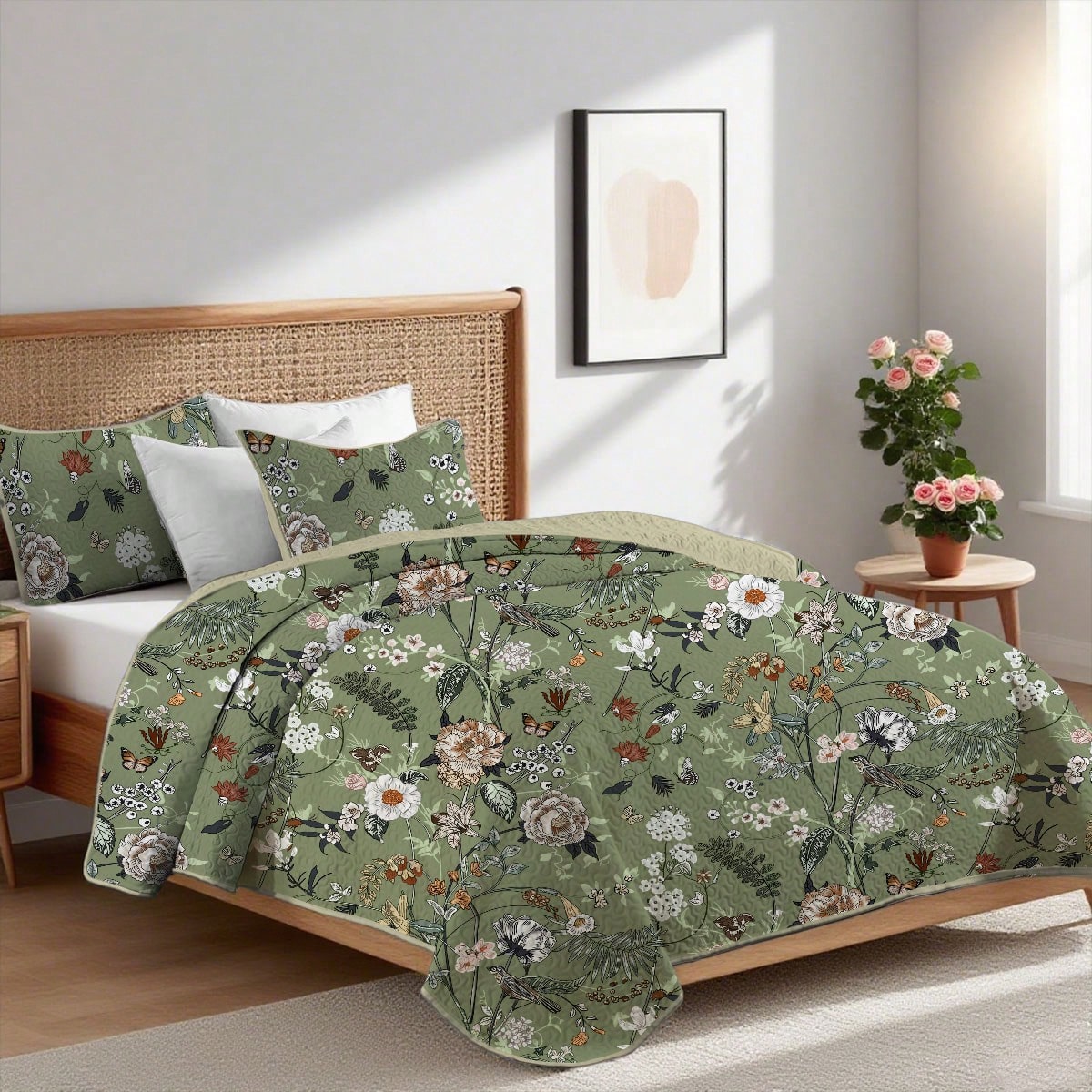 2/3 Pieces Green Floral Print Bedspread Set, Summer Quilt Set(1 Quilt + 1/2 Pillowcases), 100% Microfiber, Lightweight, Breathable, Machine Washable Summer Bedding Set, Full/Queen And Cal King Size, Room Decor