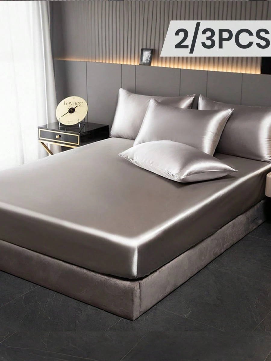 2/3pcs Fitted Sheet Set, Bedding Set, Satin Bed Sheets Set, Mattress Cover Set, Solid Color Skin-Friendly Bed Cover Set, Lightweight And Silky Smooth, Soft And Comfortable Bedding For Bedroom, Mattress Protector For Bedroom Decor, 1 Bed Sheet With 1/2 Pillowcases, Deep Pocket, For Single/Twin/Full/King/Queen Bed Sizes, Machine Washable, For Father’s Day Gift, Perfect Holiday Gift