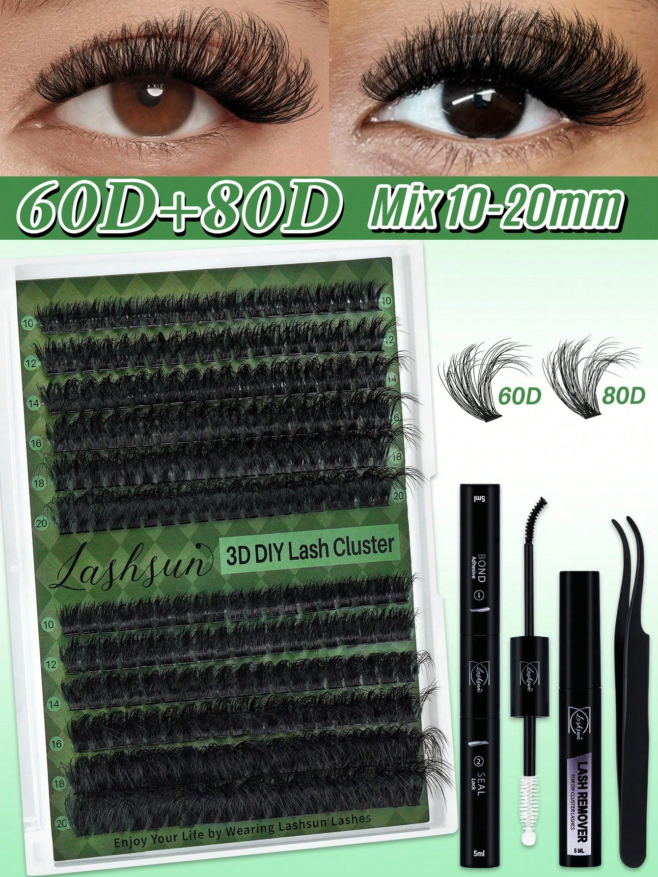 60D80D 240PCS D Cur 3D Huffy Lash ClustersMixed 10-20mm Individual Lashes Clusters Kit WithBOND&SEAL ,Remover And Tweezers For DIY AtHome&Daily Life&Dates&Party
