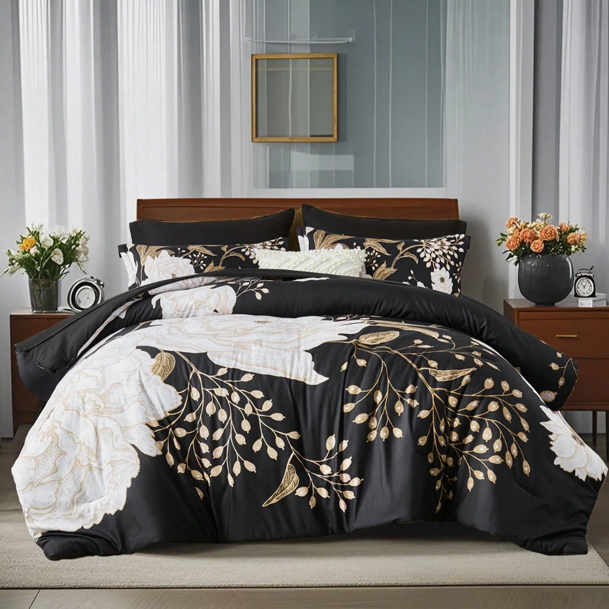 7-Piece Printed Comforter Set Queen, Large White Flower Pattern Design On Black Background, Soft And Comfortable Bedding Set, Includes 1 Comforter, 1 Fitted Sheet, 1 Flat Sheet, 2 Pillowcases And 2 Pillowshams, Christmas Gift.