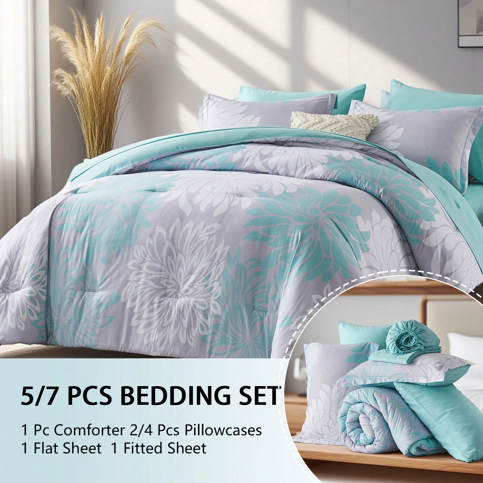7 Pieces Chic Floral Printed Bed Comforter Sets, Queen King, Soft And Comfortable Summer Bedding Sets, Bed In A Bag, Hotel Bedroom Room Decoration, 1 Comforter 2/4 Pillowcases, 1 Flat Sheet And 1 Fitted Sheet, Perfect Gift For All Four Seasons