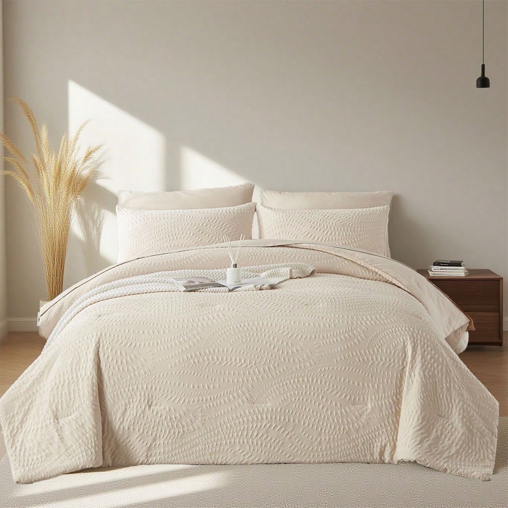 7pcs Simple And Stylish Embossed Bed Comforter Set, 100% Microfiber Soft Breathable Summer Bedding Set, Comfortable And Durable, Include 1 Comforter+1 Flat Sheet+1 Fitted Sheet+2 Pillowcases+2 Pillowsham,All-Season, Bed In A Bag, Room Decor, Best Gift