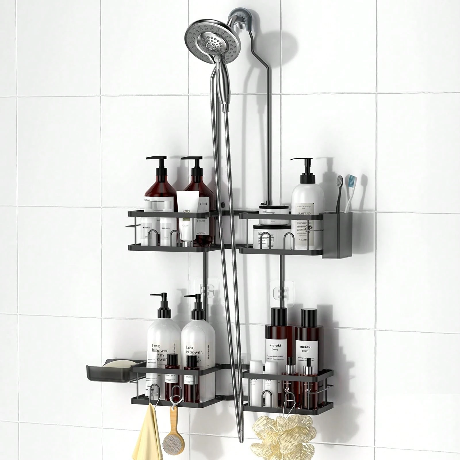 Adjustable Shower Caddy Hanging Rustproof Shower Caddy For Handheld Showerheads, Shower Organizer With Hooks Soap Holder Toothbrush Holder, Anti-Swing Shower Rack Bathroom Accessories