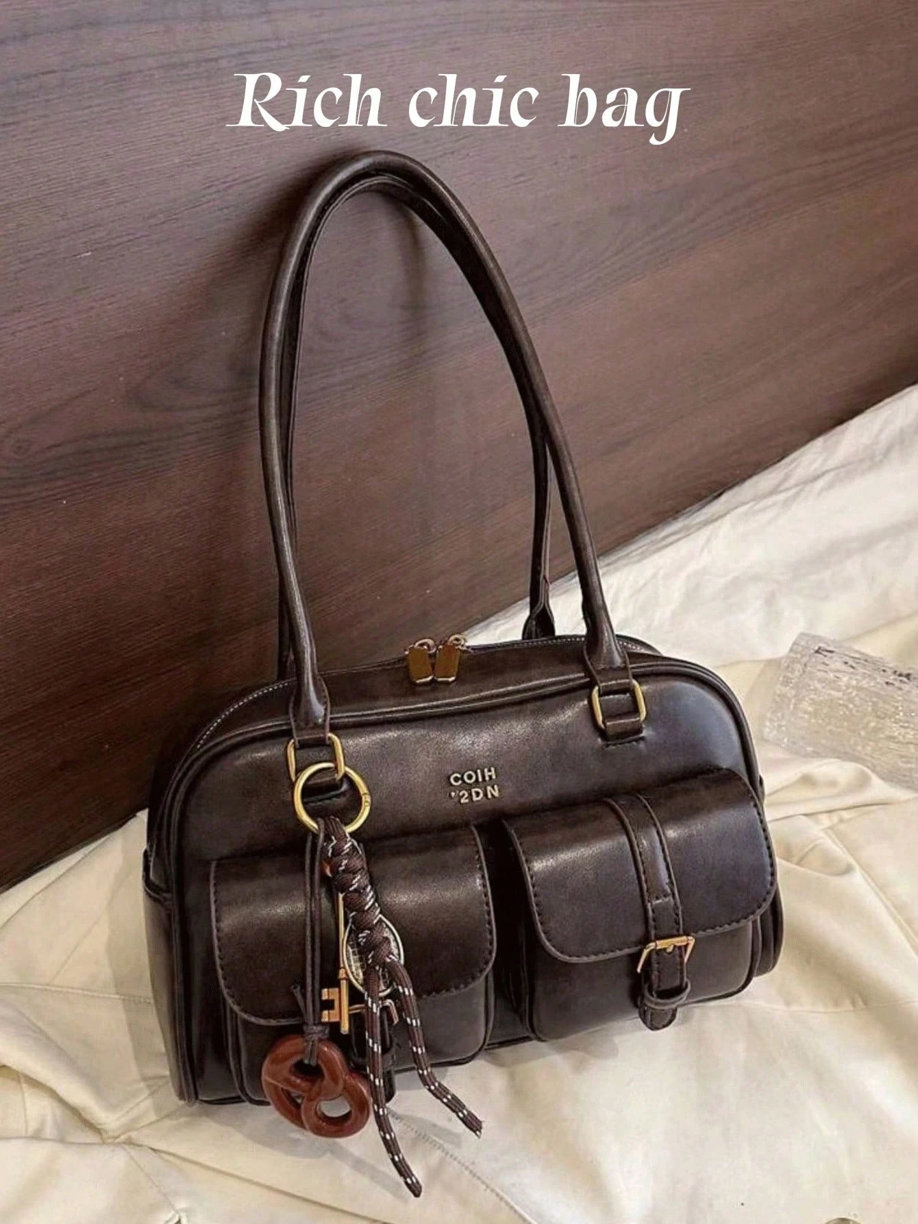 Classic Solid-Color PU Waterproof Fabric, Lettering Pattern Embellishment, Multi-Pocket Design, Shoulder Bag, Underarm Bag With Charm Accents. Ideal For Travel Shopping, Commuting To Work, Parties, And Dates.