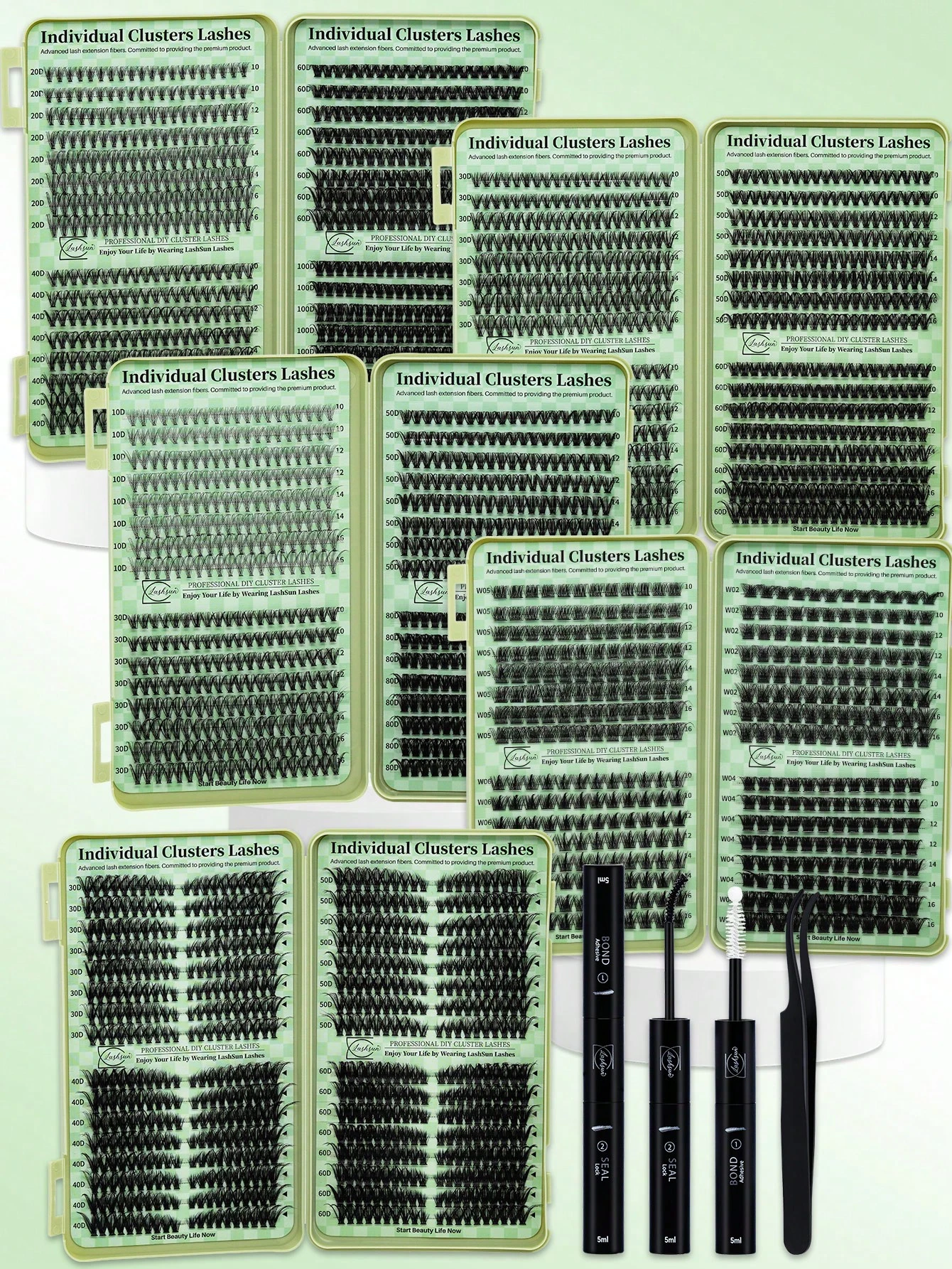 Cluster Lashes Book Kit, 640PCS/384PCS Lash Clusters D Curl Mixed 10-16mm Mega Volume Individual Lashes Wispy Lashes, 4 Styles In One Tray, Kit With BOND&SEAL And Lash Applicator For DIY At Home, Beginner Friendly