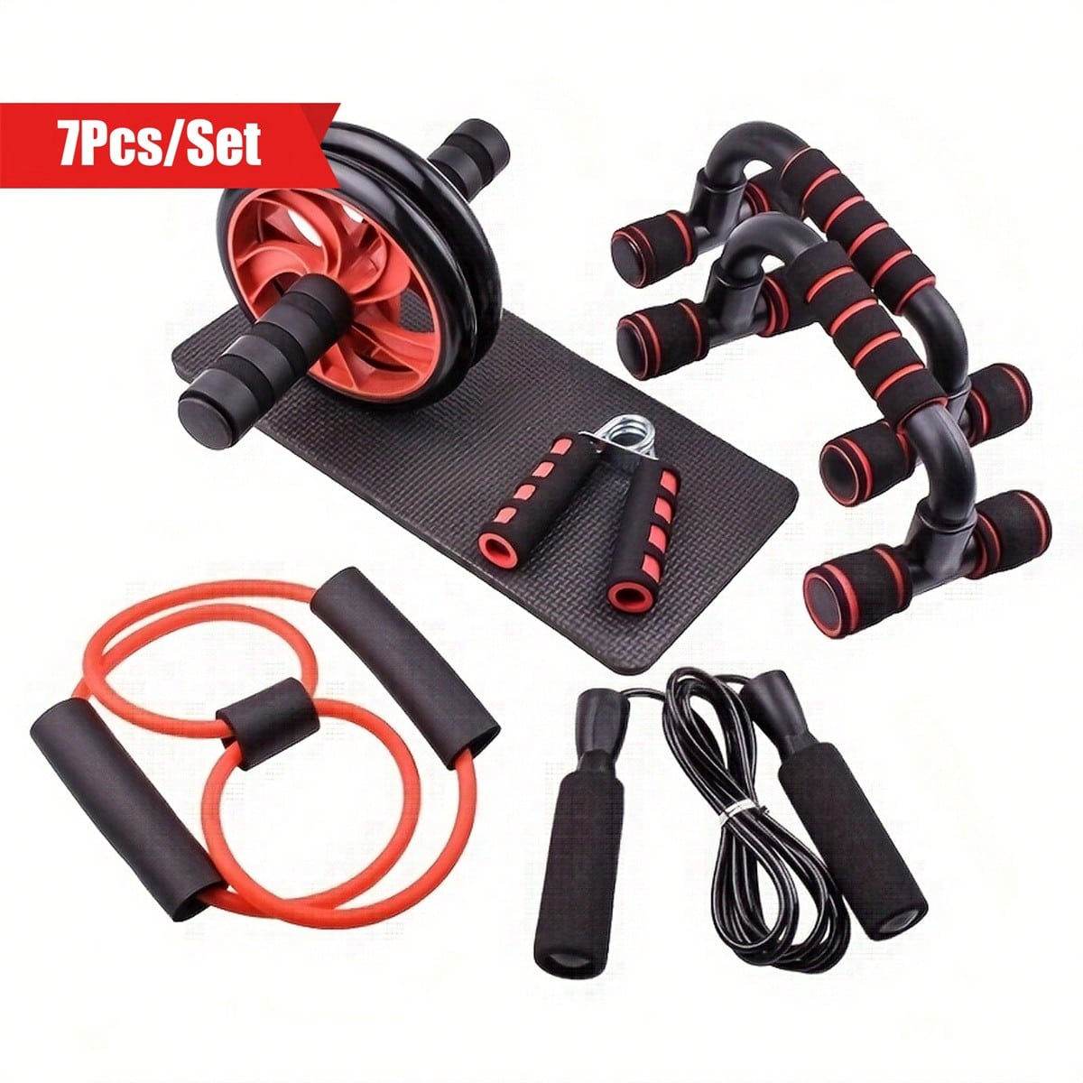 [Home Workout Kit: Push-Up Bars] 7pcs Ultimate Fitness Kit Complete Ab Workout Set With Push-Up Stand, Ab Wheel, Mini Mat, Resistance Band, Jump Rope & Hand Gripper – Strengthen Core, Build Muscle, Burn, Perfect For Fitness Enthusiasts