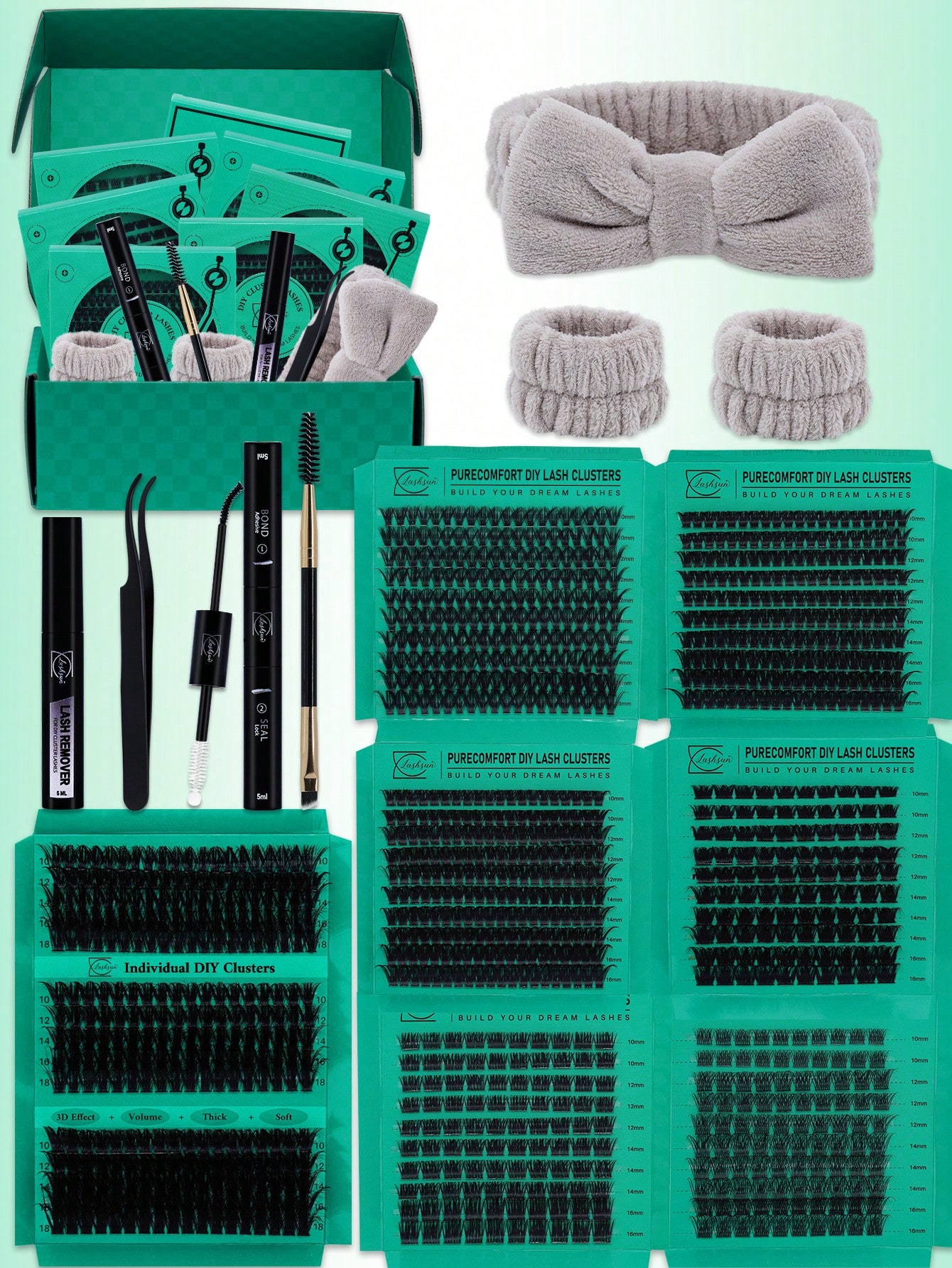 Lashsun 1170pcs D Curl High Capacity Lashes Kit, 9 Styles Mixed Length Lash Volume&Fluffy Eyelash Clusters Kit Comes With Bond&Seal, Lash Remover, Lash Brush,Headband Wristband And Tweezers