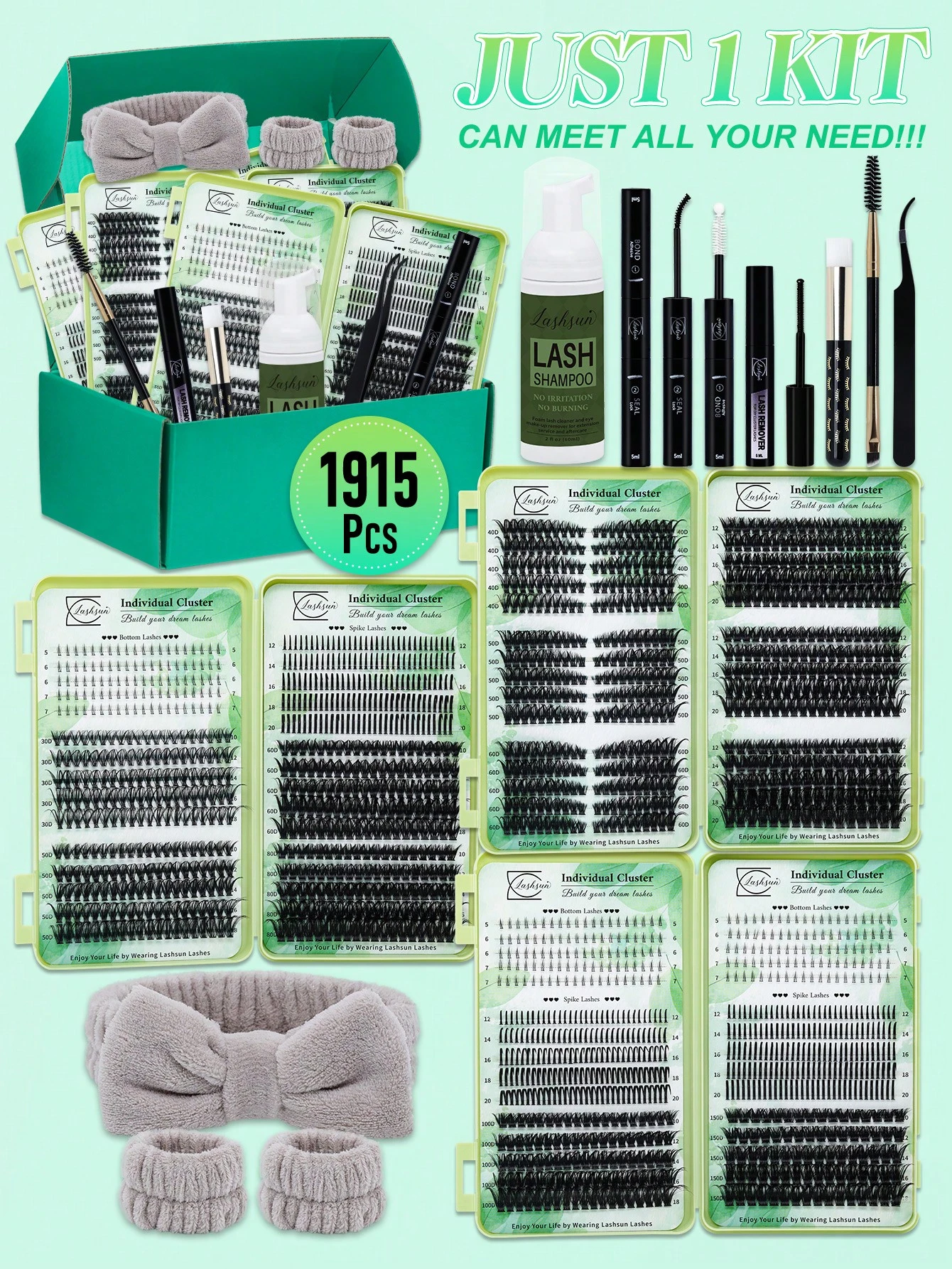 Lashsun 1915 PCS Lash Clusters Kit D Curl 11 Styles Cat/Volume/Spikes/Bottom Lashes Book Kit With Bond&Seal Lash Remover Brush Lash Applicator Headband Wristband Set Lash Shampoo Brush, Perfect For Beginners&Proficient, DIY At Home Easily, Easy Apply For Makeup Daily
