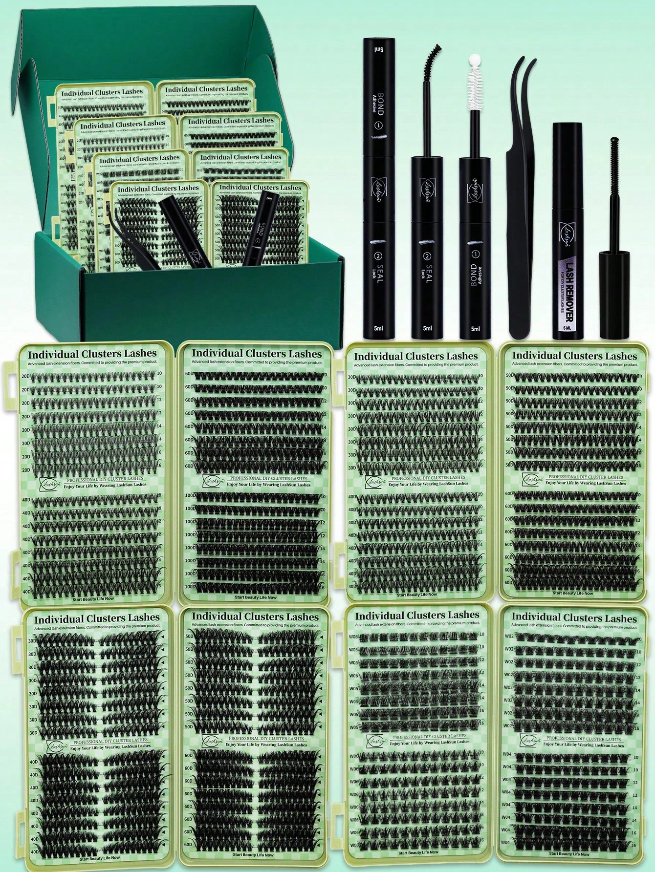 Lashsun 2304 Clusters Lashes Book High Capacity Lashes Kit, D Curl Lash Clusters Multiple Styles Mixed 10-16mm Mega Volume Individual Lashes Wispy Lashes Cluster Lash Set Comes With Bond&Seal Lash Remover And Tweezers For DIY Use At Home, Beginner Friendly