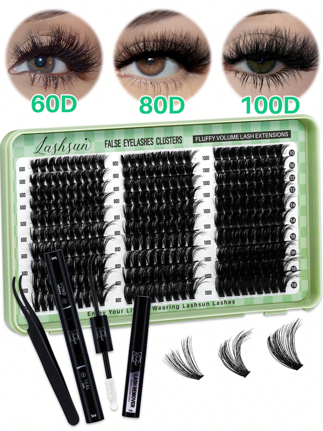 Lashsun 280PCS D Curl 60D80D100D 10-18mm Mixed Length 3D Effect Volume Cluster Lashes Kit Soft And Comfortable Individual Lash Kit Long-Lasting Lashes Kit With Lash Bond&Seal Lash Remover And Tweezers Eyelash At Home For Daily Life&Cosplay&Dates And Party