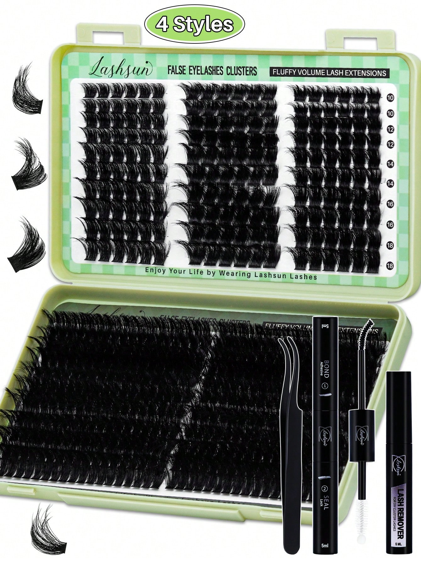 Lashsun 540pcs D Curl 4 Styles 10-18mm/14-22mm Mixed Length Fluffy Volume Cluster Lashes Kit Soft And Comfortable False Eyelashes Long-Lasting Lashes Kit With Lash Bond&Seal Lash Remover And Tweezers Eyelash At Home For Daily Life&Dates And Party
