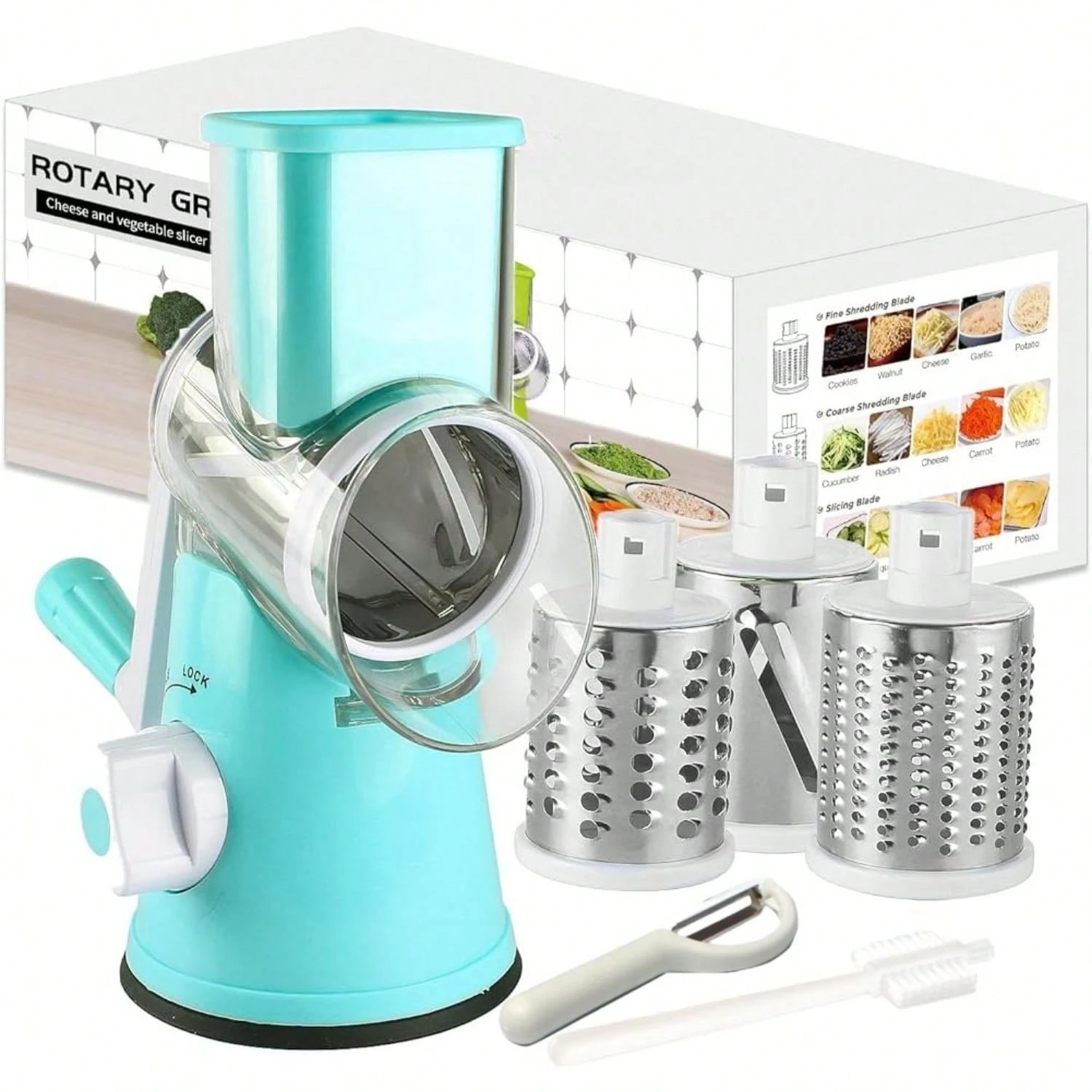 Manual Rotary Cheese Grater – Round Mandoline Slicer With Strong Suction Base, Vegetable Slicer Nuts Grinder Cheese Shredder With Clean Brush MIUVA
