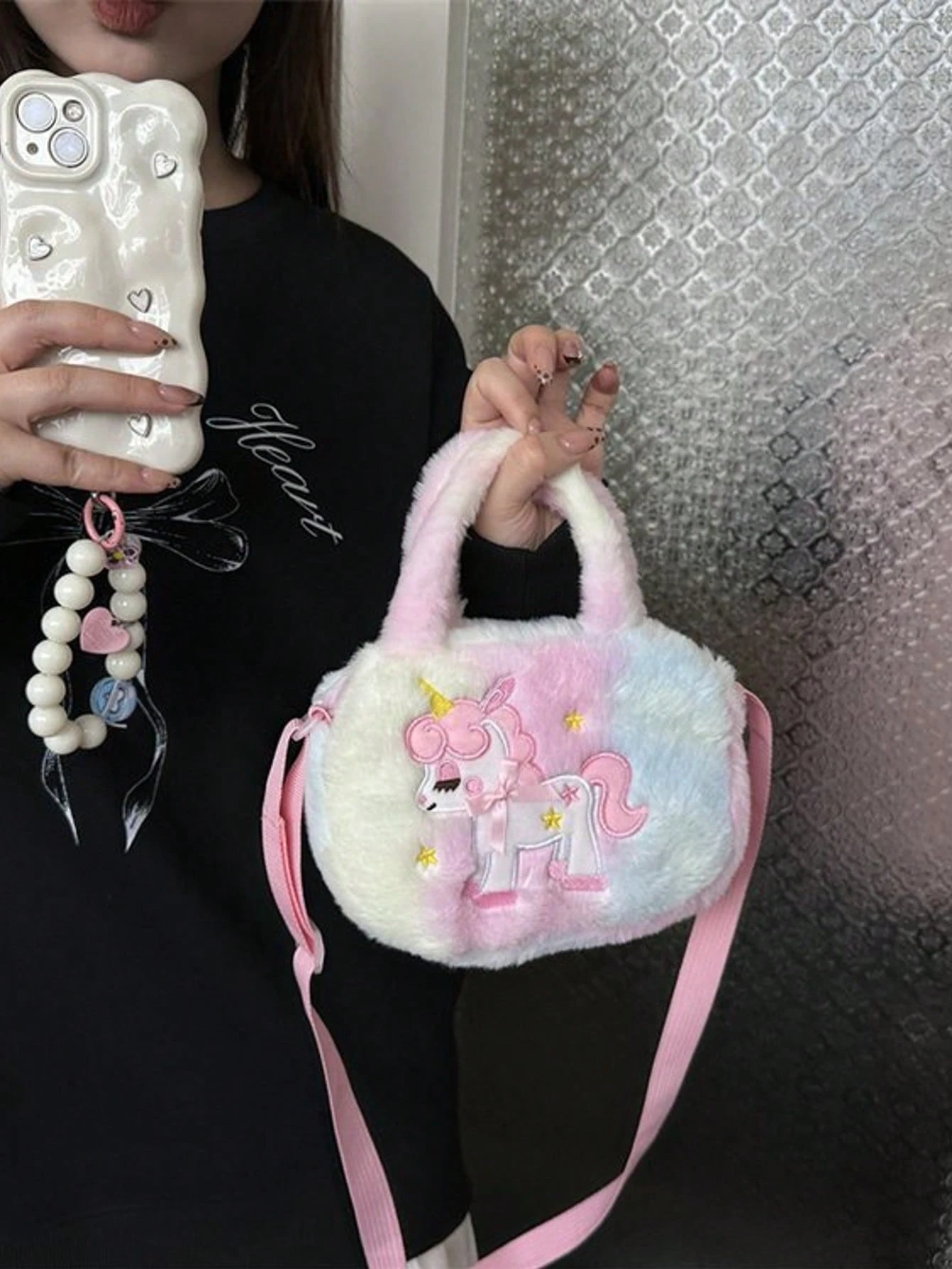 Oaoleer 1PC Cartoon Unicorn Plush Shoulder Bag, Plush Unicorn Tote Bag Plush Crossbody Handbags Rainbow Fluffy Fuzzy Unicorn Purse Bag For Kids Gift