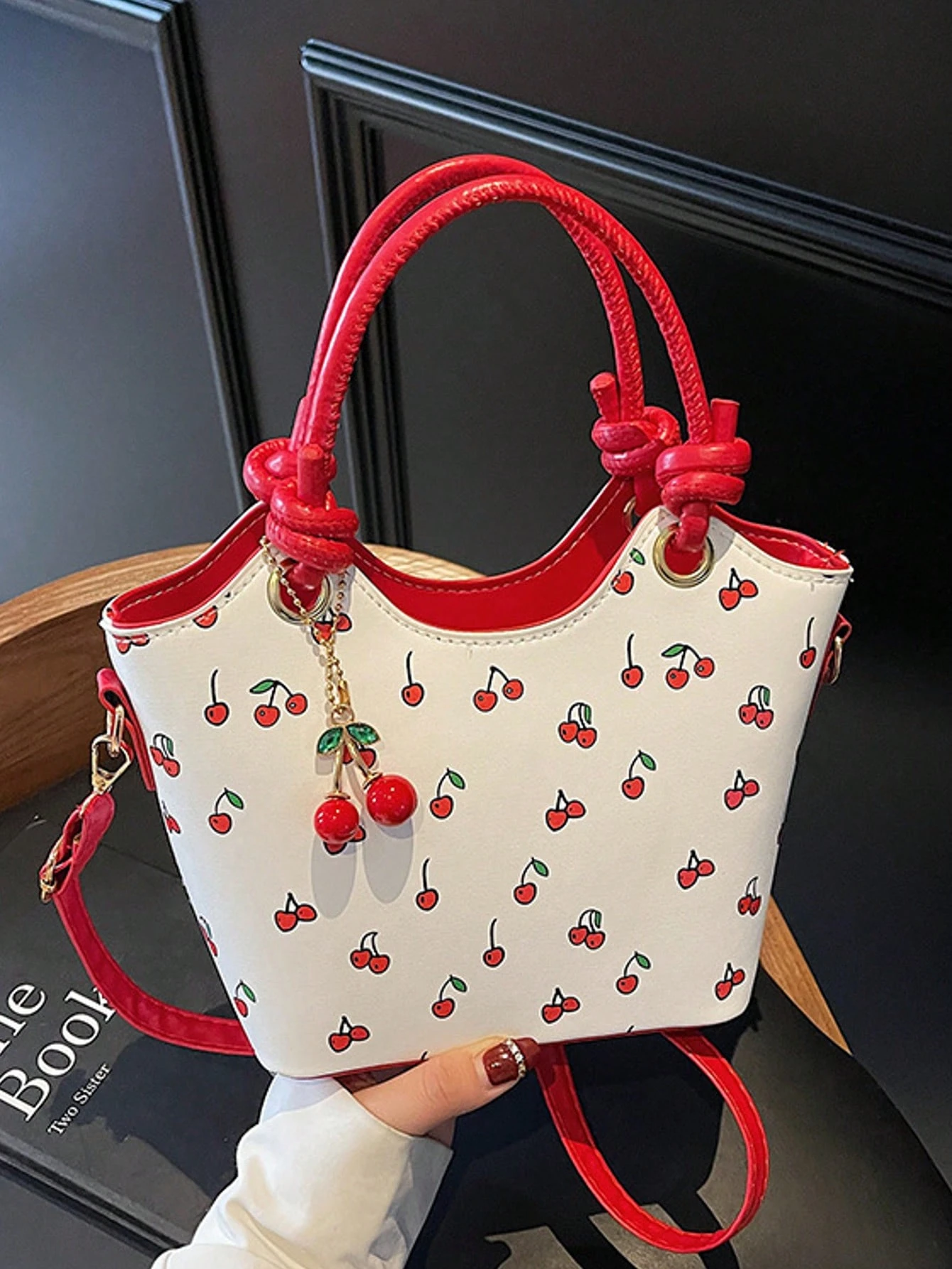 Oaoleer 1PC PU Leather Bucket Cherry Printed Crossbody Bag For Women Cute Y2K Top-Handle Bag Fruit Print Small Tote Handbag Gifts