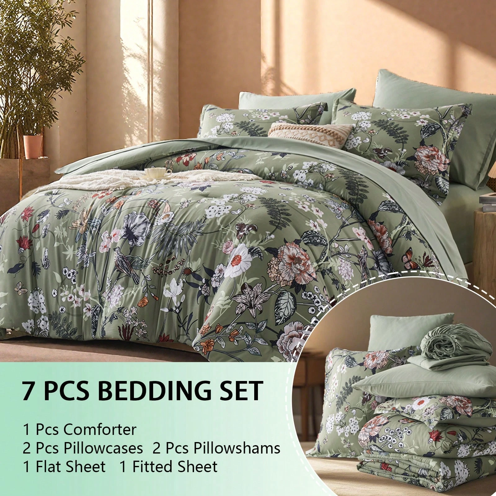 Queen Size 7 Pcs Comforter Sets Queen, Bohemian Flower Printed Summer Bedding Sets, 100% Microfiber, Soft And Comfortable, Hotel Bedroom Room Decor, Bed In Bag, Perfect Gift, Include 1 Comforter , 4 Pillowcases , 1 Flat Sheet , 1 Fitted Sheet