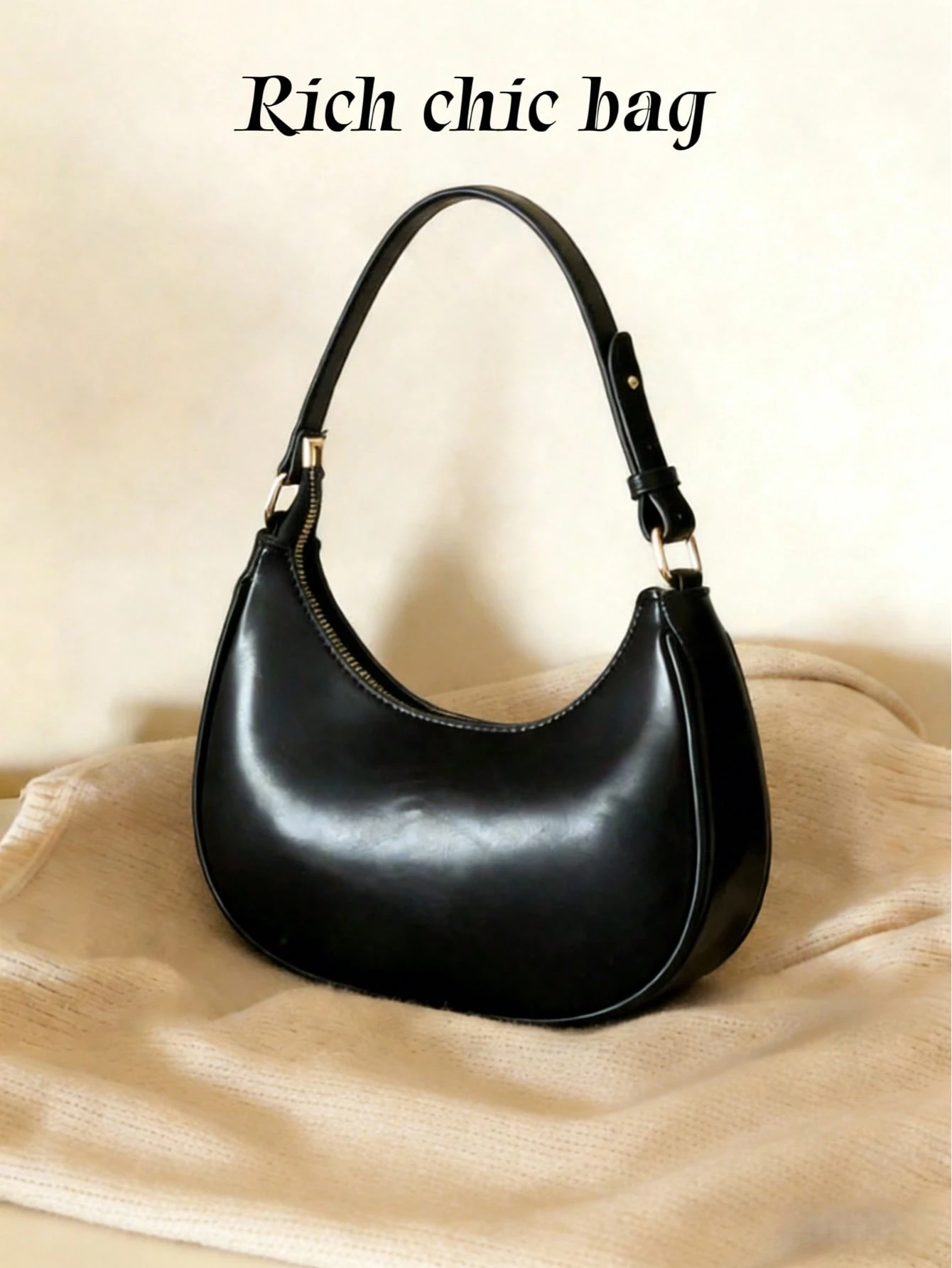 Rich Chic Bag New Fashionable And Simple Black Crescent-Shaped Bright Surface Shoulder Bag, With A Distinctive Texture And Classic Look That’s Suitable For Daily And Commuting Use, Detachable Shoulder & Crossbody Bag, Business Casual Women Bag, Perfect For Office, Business And Work, Japanese Bag, Vintage Bag For Women, Street & Bag For Women.