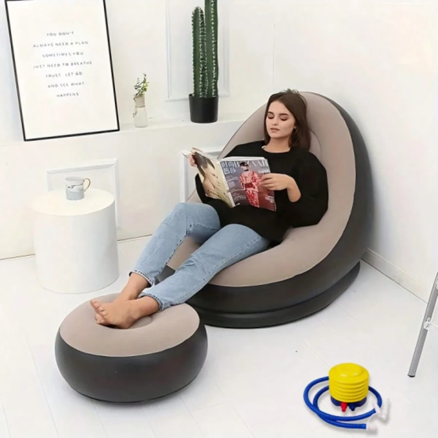 TAIMASI Inflatable Lounge Chair For Adults With Inflatable Pump, Folding Portable Lazy Sofa With Foot Stool Lazy Flocking Recliner Chair Air Couch Sofa For Indoor Livingroom Gaming Bedroom Office Balcony, Outdoor Travel Camping-Brown