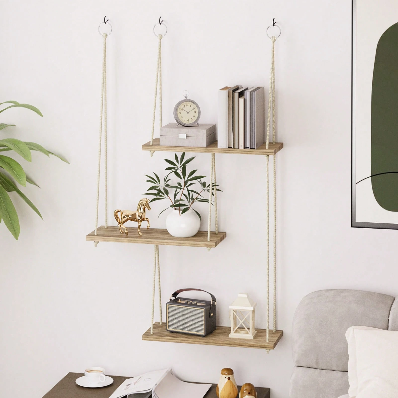 Tomnk 3 Tier Hanging Plant Shelves For Wall, Boho Wall Decor Plant Rack Floating Shelves Rope Rustic Wood Organizer Storage Hanger For Aesthetic Home Bedroom Kitchen Bathroom- Rustic Brown