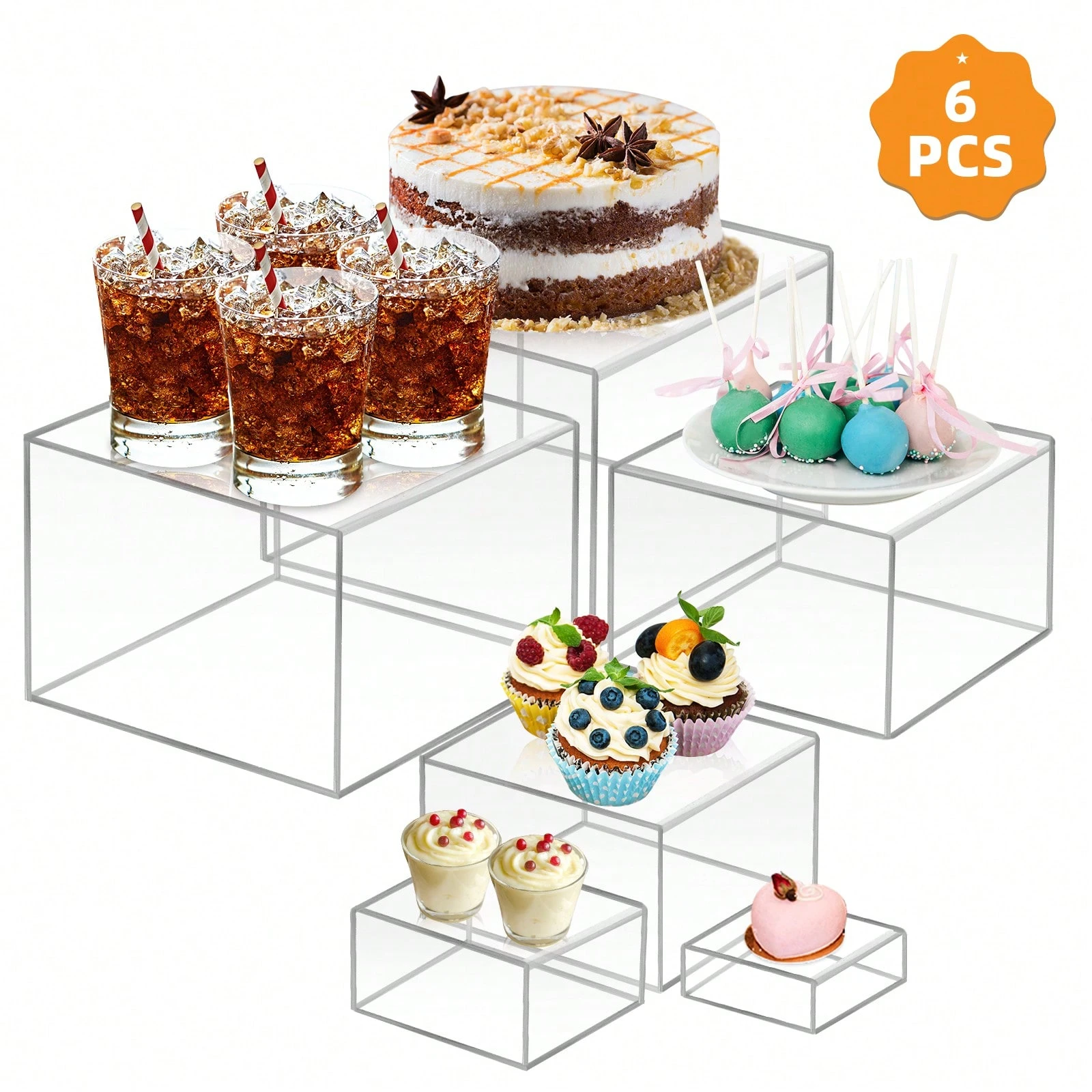 Tomnk 6Pcs Clear Acrylic Boxes For Display, Food Risers For Buffet Table Party Cupcake Candy Desset,Acrylic Nesting Risers Display Stands Cube Boxes With Hollow Bottoms