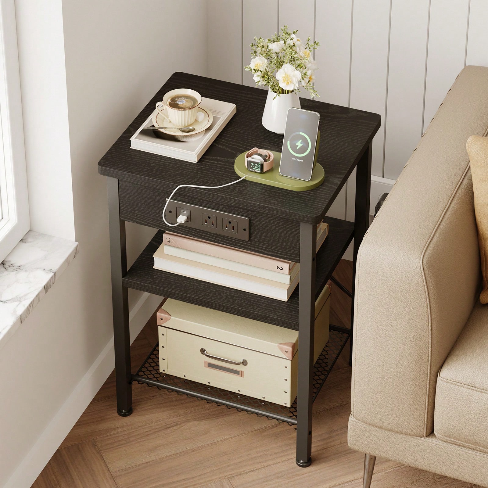 Tomnk End Table With Charging Station, Bedside Table, Night Stand With Storage, 3-Tier Bed Side Table, End Table For Bedroom, Living Room