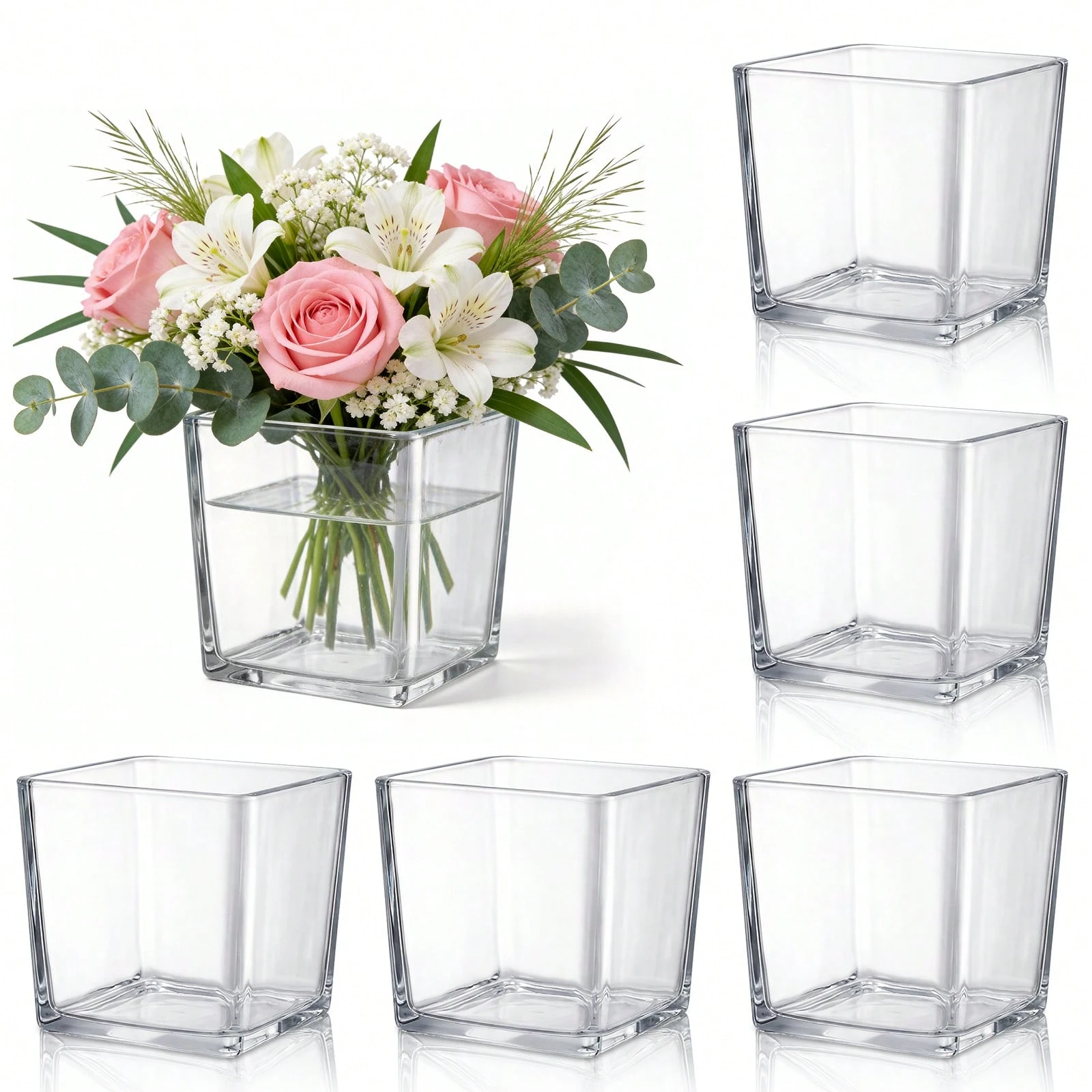 Tomnk Square Clear Glass Vases Set Of 6, Flower Vases For Centerpieces, Square Vase For Centerpieces, Small Vase For Wedding, Party, Home Office Decoration, Spring Decor, Garden Decor