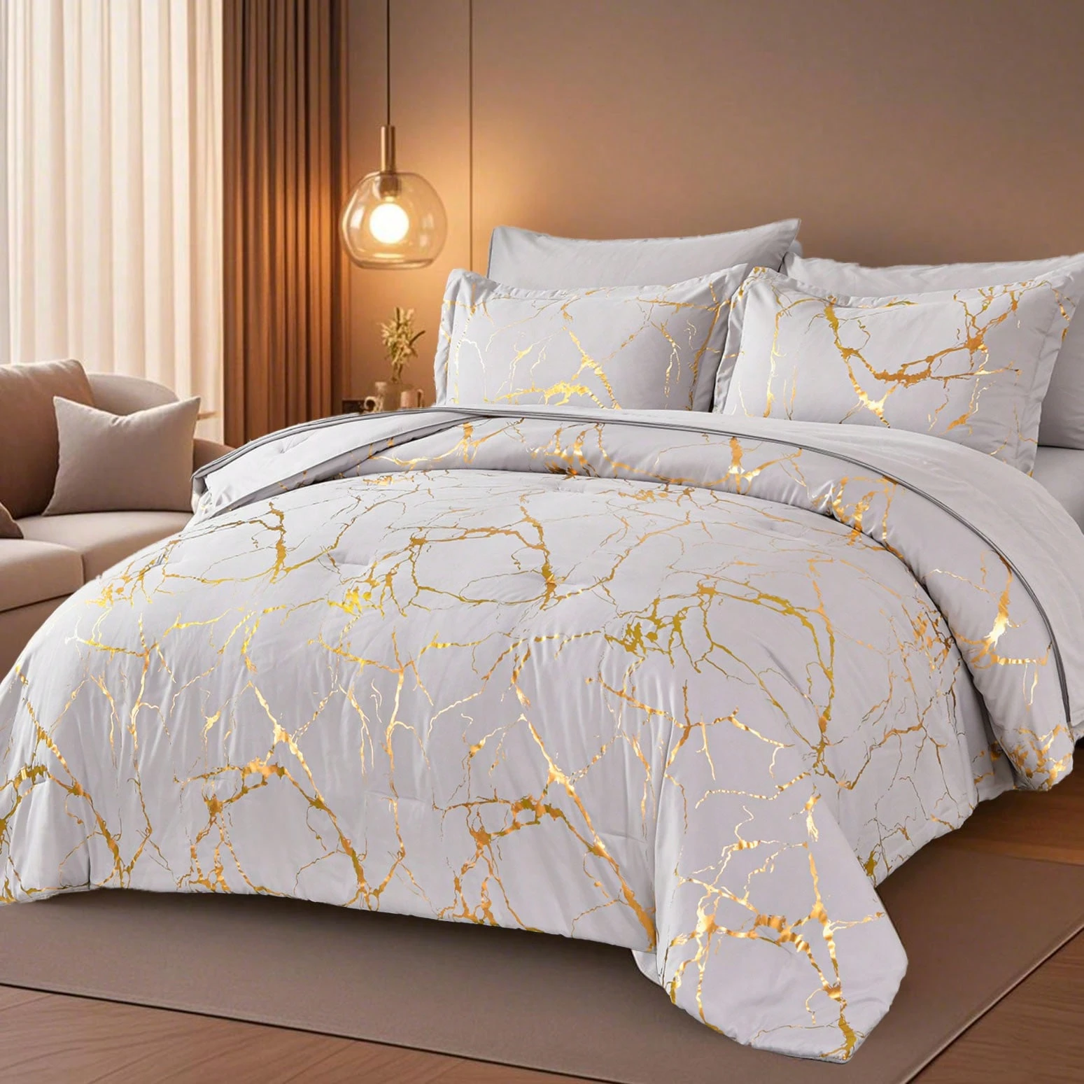 Warm And Gilded Comforter Sets Queen, 7 – Pcs 100% Microfiber, Soft And Comfortable Summer Bedding Set, Hotel Bedroom Room Decor,Bed In Bag, Suitable For All Four Seasons, Ideal Gift, 4 Pillowcases, 1 Flat Sheet, 1 Fitted Sheet And 1 Comforter